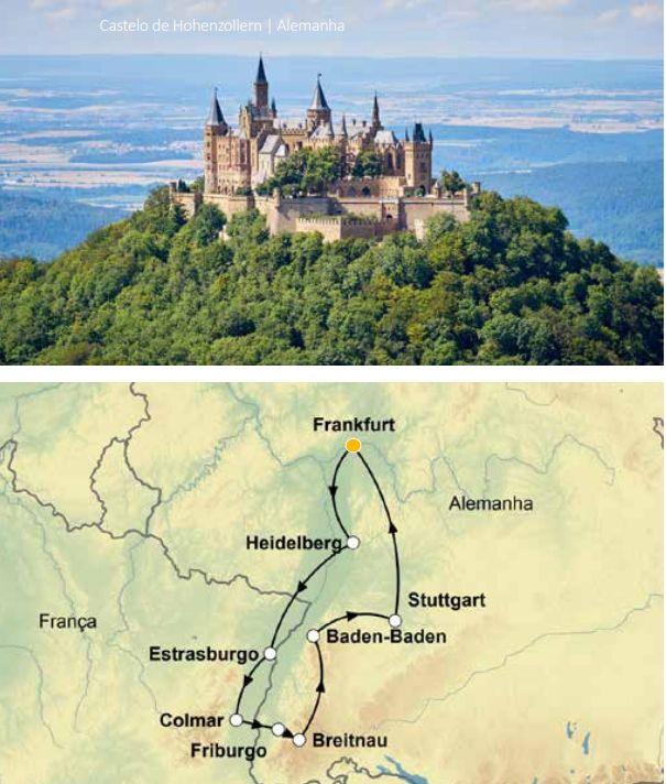 Guia acompanhante bilíngue em espanhol e português do 2° ao 7° dia. 7 dias de viagem passando por Frankfurt, Heidelberg, Estrasburgo, Colmar, Friburgo, Vogtsbauernhof, Cascatas de Triberg, Friburgo (Floresta Negra), Lago Titisee, Breitnau, Castelo Hohenzollern, Baden-Baden, Stuttgart, Frankfurt (sem hospedagem)